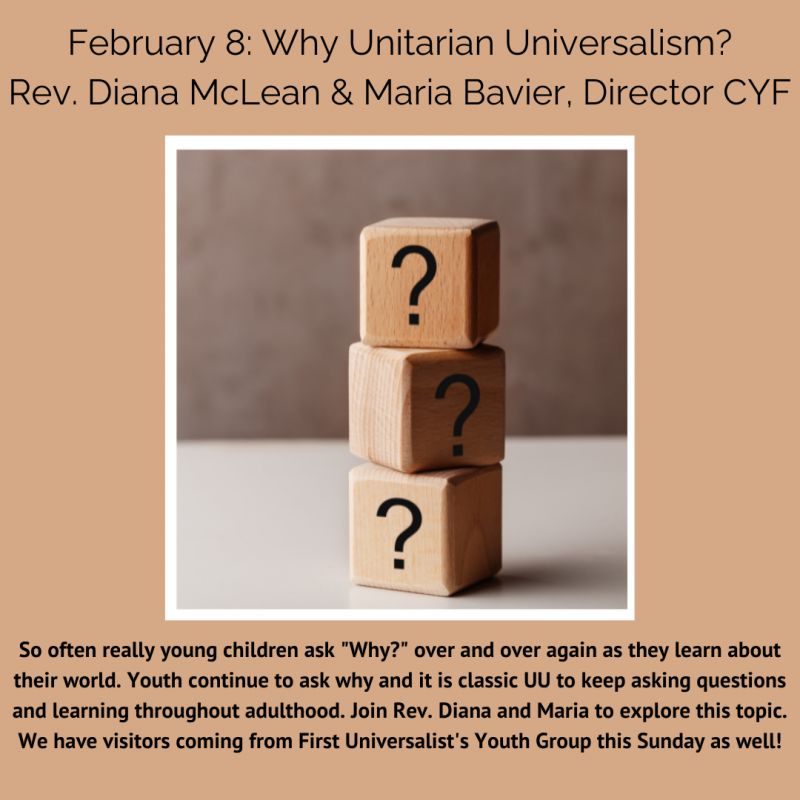 February 8: Why Unitarian Universalism? Rev. Diana McLean and Maria Bavier, Director of CYF